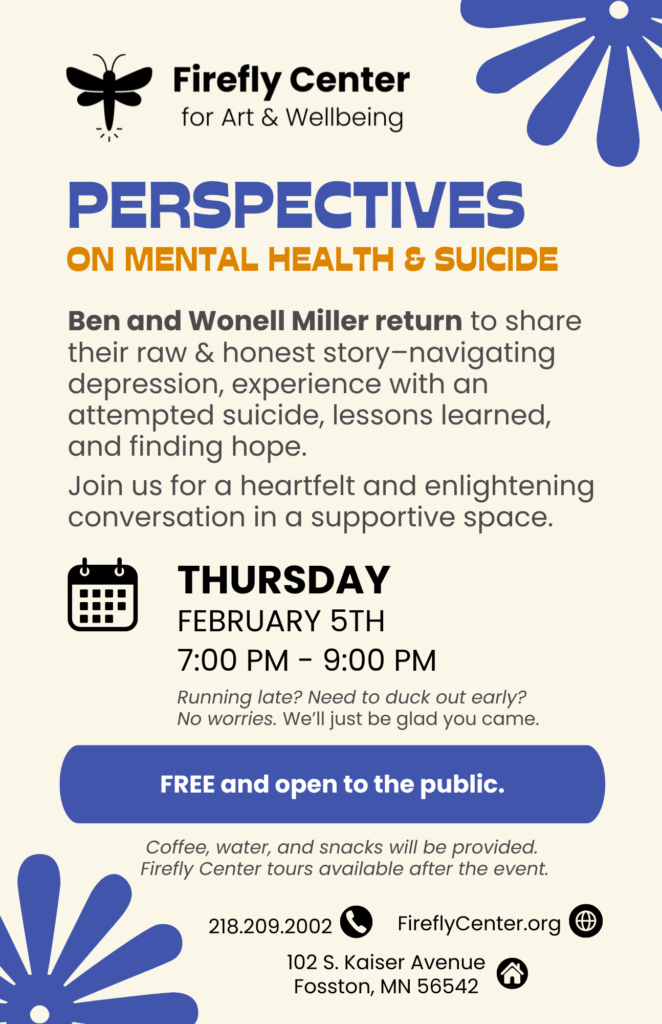 Perspectives on Mental Health and Suicide Thursday, February 5, 2026 7:00 PM 9:00 PM Firefly Center for Art & Wellbeing Fosston, MN United States (map) Google Calendar ICS